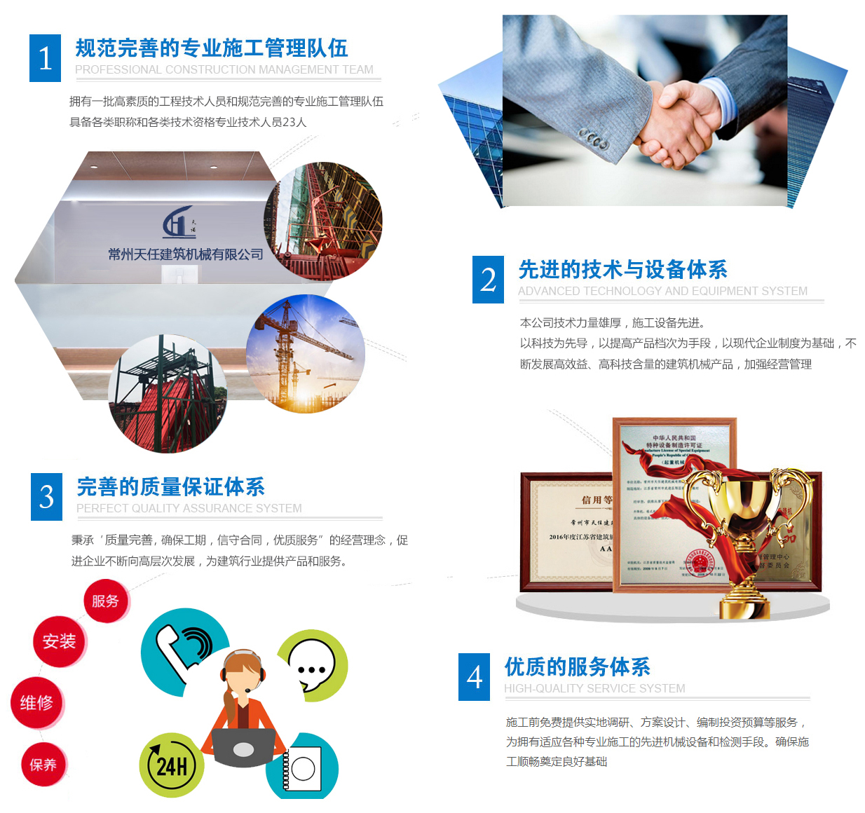 公司主要從事施工升降機、普通塔式起重機的制造、租賃、安裝、改造與維修等一條龍服務;擁有施工升降機(SCD200/200、SC200/200),QTZ63型普通塔式起重機,物料提升機(GJT10A)三大系列產品,并有中華人民共和國特種設備檢驗檢疫總局頒發(fā)的制造、改造與維修生產許可證。